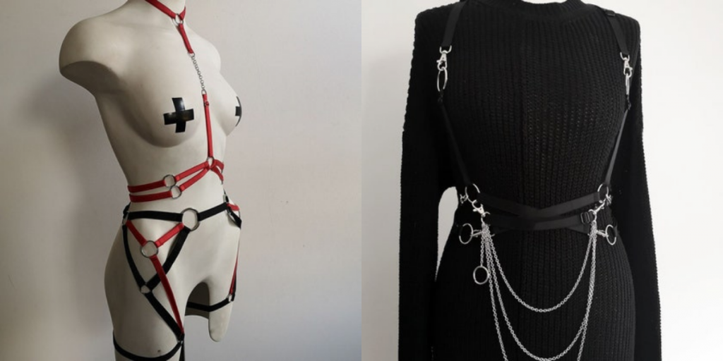 Black-owned and London-based, Bound UK is another indie maker creating delicate harnesses for great prices. They’re perfect if you’re on a budget, as you can take a plain black outfit, could be a summer dress, a mesh top or a jumper, and make it pop with a super cool harness. Straps, O rings and chains galore. They do full body harnesses, ones for just your top half, belts, jewellery, and even hats!