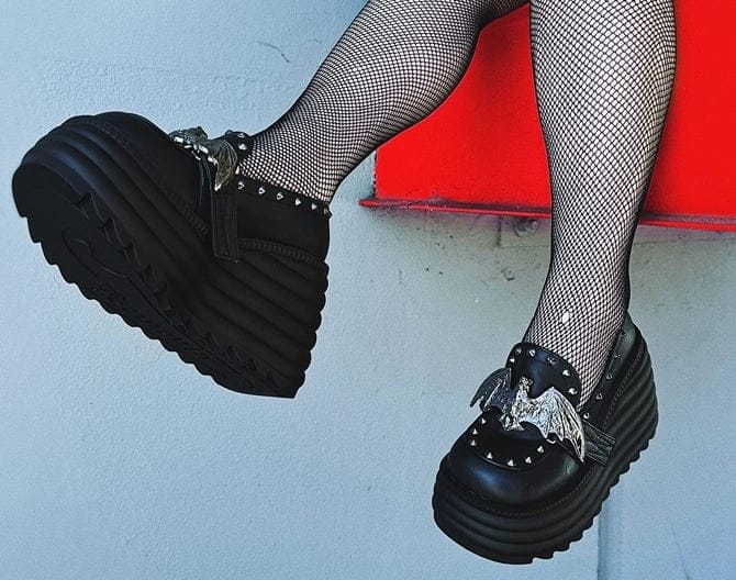 Demonia is one of the most popular goth footwear brands. Known for their iconic platforms, they do loads of different styles that range from sandals to mary janes and trainers. They started out in Southern California, but you can find them everywhere now. They have vegan options and accessories like chain harnesses and laces so you can really make them unique to you.
